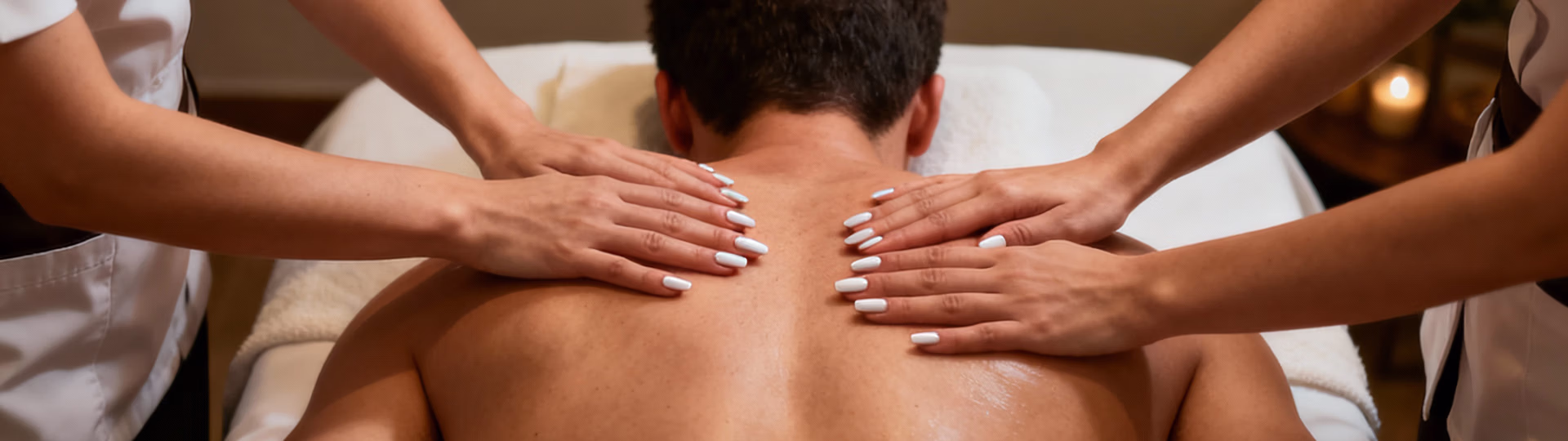 Dois terapeutas trabalham em perfeita sintonia, aplicando toques simultâneos e harmoniosos para proporcionar uma sensação de equilíbrio profundo e envolvente.